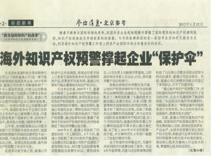 2009年北京市海外知識(shí)產(chǎn)權(quán)預(yù)警項(xiàng)目,國(guó)電富通公司針對(duì)火力發(fā)電廠除渣系統(tǒng)對(duì)印度開展知識(shí)產(chǎn)權(quán)海外預(yù)警工作,由三聚陽(yáng)光公司具體實(shí)施。與此同時(shí),國(guó)電富通公司相關(guān)產(chǎn)品進(jìn)入印度市場(chǎng)投標(biāo)。