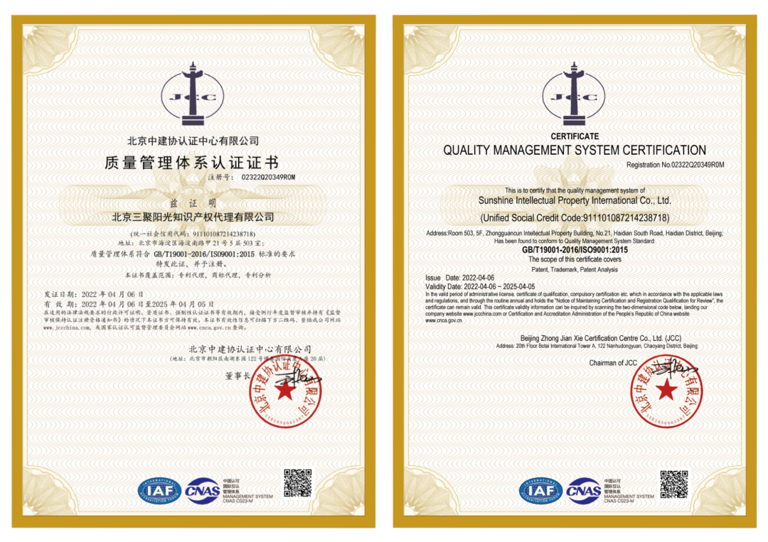 4月,三聚陽光知識產(chǎn)權(quán)集團旗下北京三聚陽光知識產(chǎn)權(quán)代理有限公司順利通過ISO9001質(zhì)量管理體系評審工作,獲得ISO9001質(zhì)量管理體系認(rèn)證證書。三聚陽光一直專注于全面提升知識產(chǎn)權(quán)代理機構(gòu)的服務(wù)水平、服務(wù)質(zhì)量、專業(yè)能力和素養(yǎng)。通過ISO9001認(rèn)證,表明北京三聚陽光知識產(chǎn)權(quán)代理有限公司在專利代理、商標(biāo)代理、專利分析等方面已經(jīng)達到國際標(biāo)準(zhǔn),并且能持續(xù)穩(wěn)定地向客戶提供滿意和符合預(yù)期的相關(guān)服務(wù)。