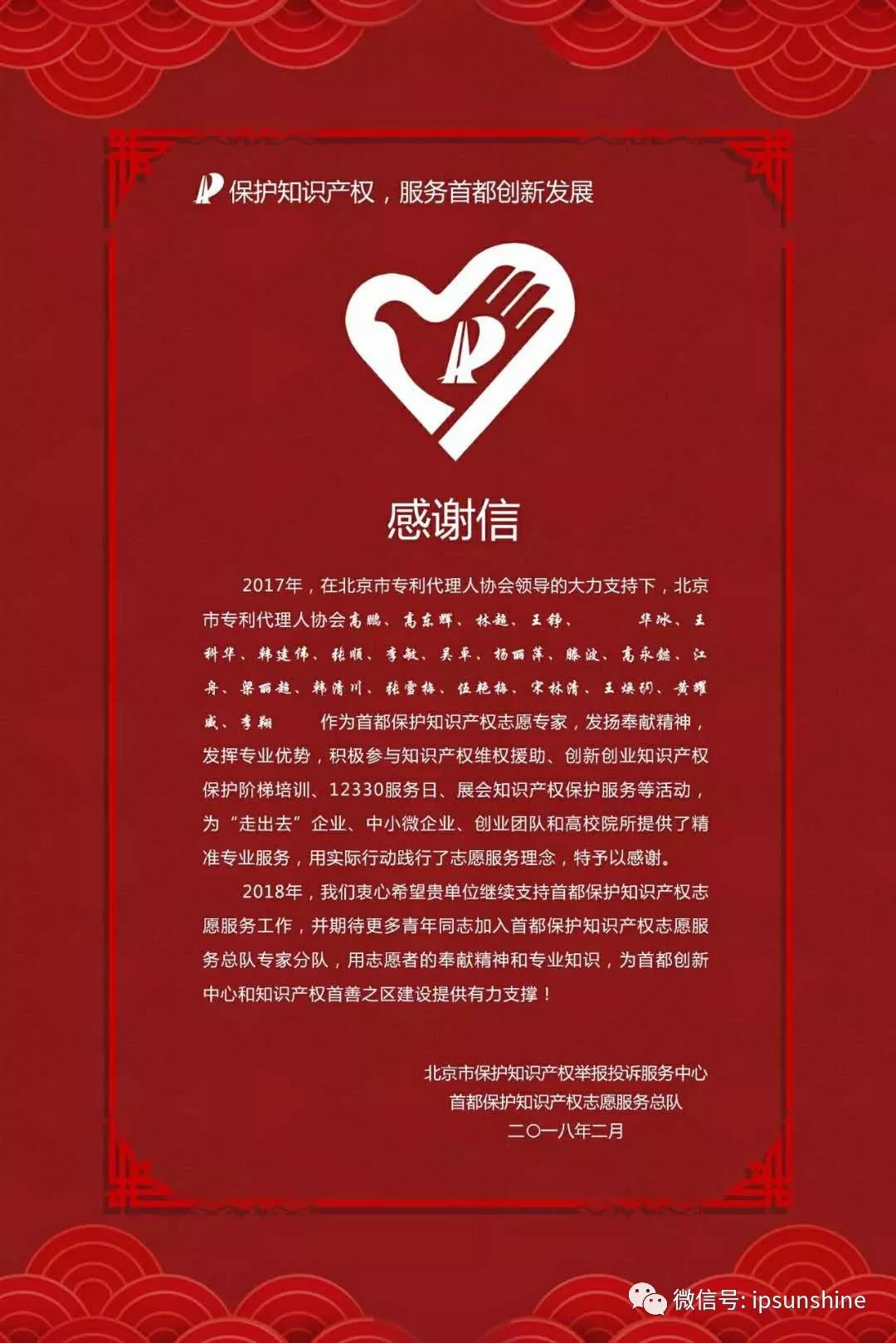 日前,北京市保護(hù)知識(shí)產(chǎn)權(quán)舉報(bào)投訴服務(wù)中心、首都保護(hù)知識(shí)產(chǎn)權(quán)志愿服務(wù)總隊(duì)發(fā)出感謝信,對(duì)在2017年積極參與知識(shí)產(chǎn)權(quán)維權(quán)援助、創(chuàng)新創(chuàng)業(yè)知識(shí)產(chǎn)權(quán)保護(hù)階梯培訓(xùn)、12330服務(wù)日、展會(huì)知識(shí)產(chǎn)權(quán)保護(hù)服務(wù)等活動(dòng)的22位首都保護(hù)知識(shí)產(chǎn)權(quán)志愿專家表示感謝,其中包括了來自三聚陽光的李敏、高東輝、林超、高鵬等四位志愿專家。