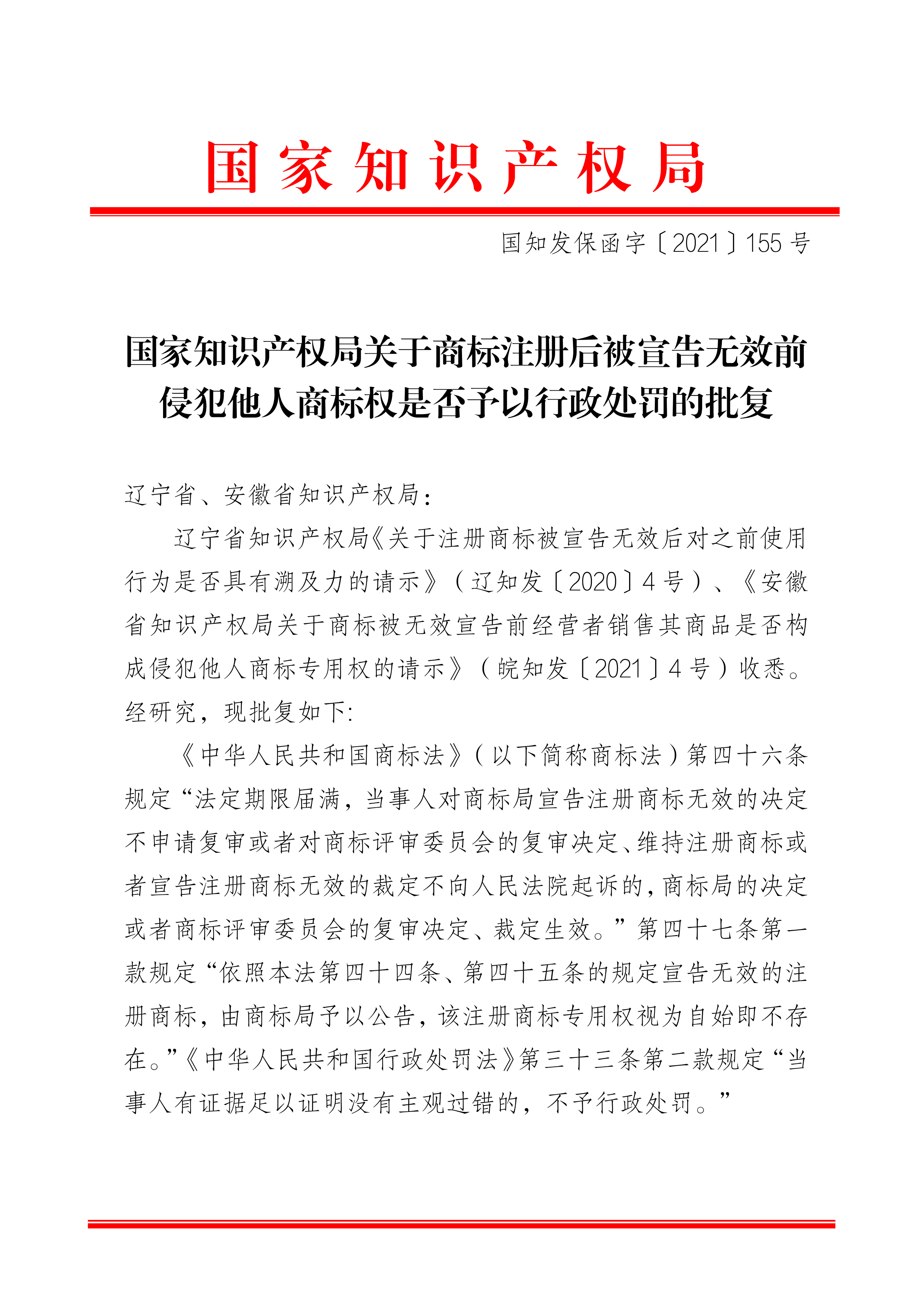 日前,國(guó)家知識(shí)產(chǎn)權(quán)局政府信息公開(kāi)辦公室依照相關(guān)規(guī)定作出《政府信息公開(kāi)答復(fù)書(shū)》,同時(shí)隨附《國(guó)家知識(shí)產(chǎn)權(quán)局關(guān)于商標(biāo)注冊(cè)后被宣告無(wú)效前侵犯他人商標(biāo)權(quán)是否予以行政處罰的批復(fù)》(國(guó)知發(fā)保函字〔2021〕155號(hào))反饋我司。