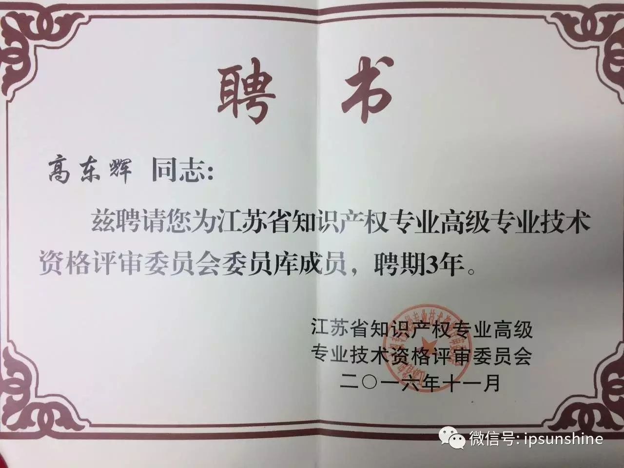 近日,江蘇省知識(shí)產(chǎn)權(quán)專業(yè)高級(jí)專業(yè)技術(shù)資格評(píng)審委員會(huì)發(fā)來聘書,聘請(qǐng)我司副總經(jīng)理高東輝作為江蘇省知識(shí)產(chǎn)權(quán)專業(yè)高級(jí)專業(yè)技術(shù)資格評(píng)審委員會(huì)委員庫成員。