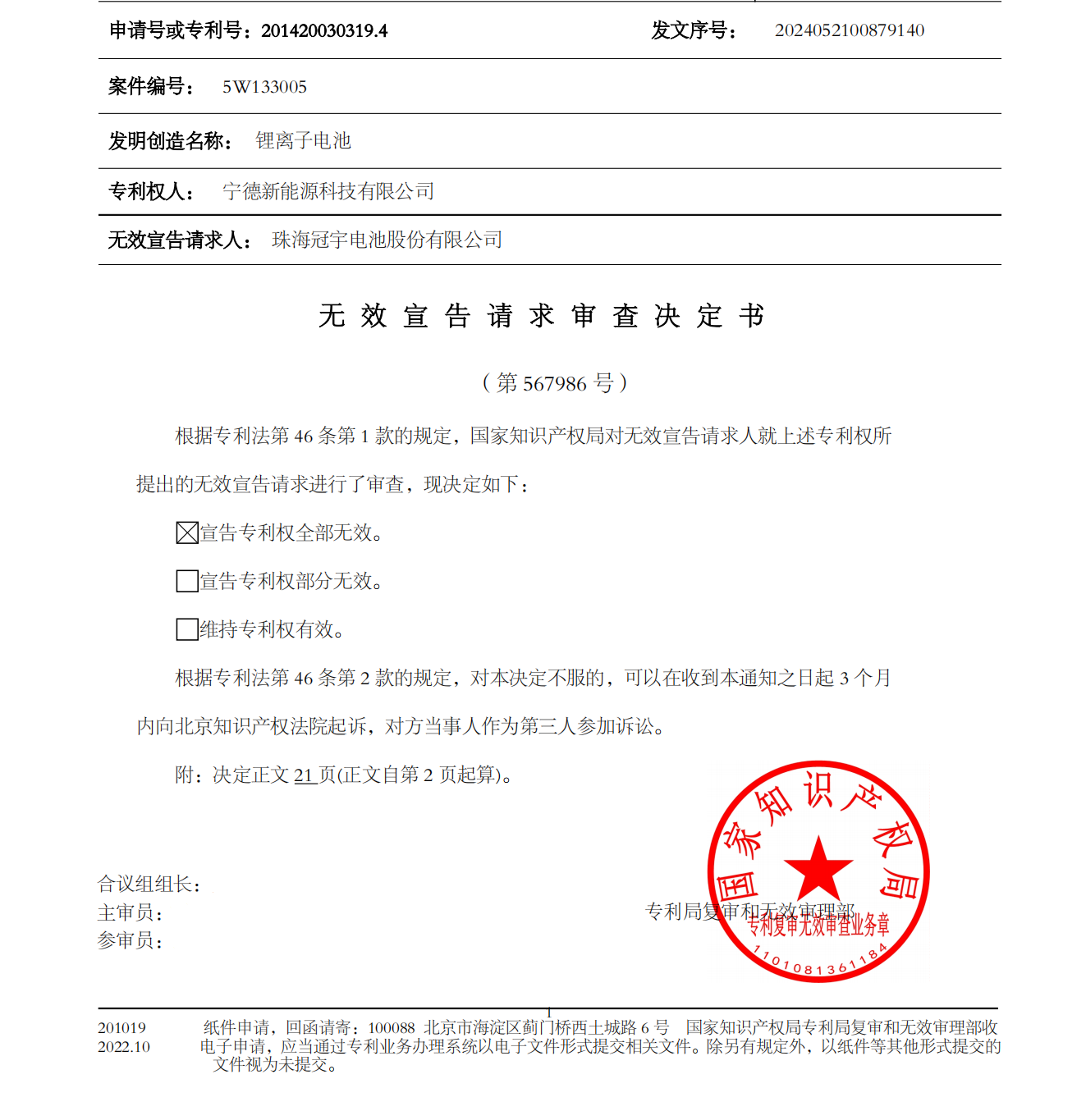 索賠1.05億鋰電池專利宣告無效,珠海冠宇贏得與寧德新能源專利無效糾紛
