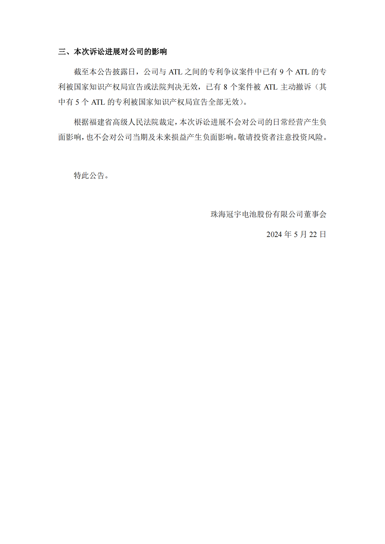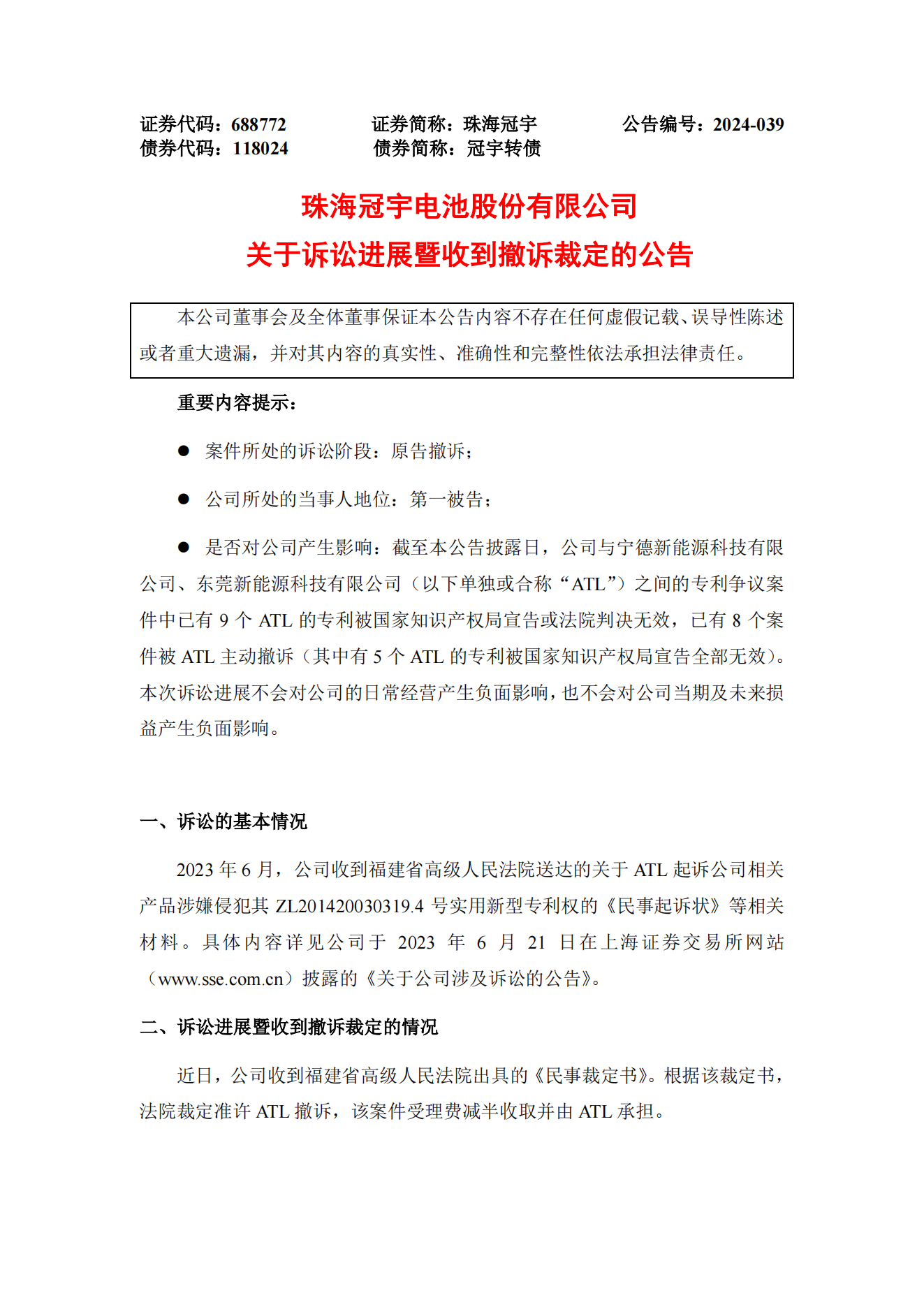5月22日,珠海冠宇在寧德新能源撤訴后發(fā)布公告,詳細介紹了關于這一專利的訴訟情況。