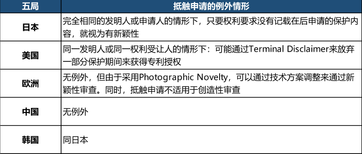 抵觸申請方面,由于各國規(guī)定不盡相同,有必要進行簡單總結(jié)例外情形: