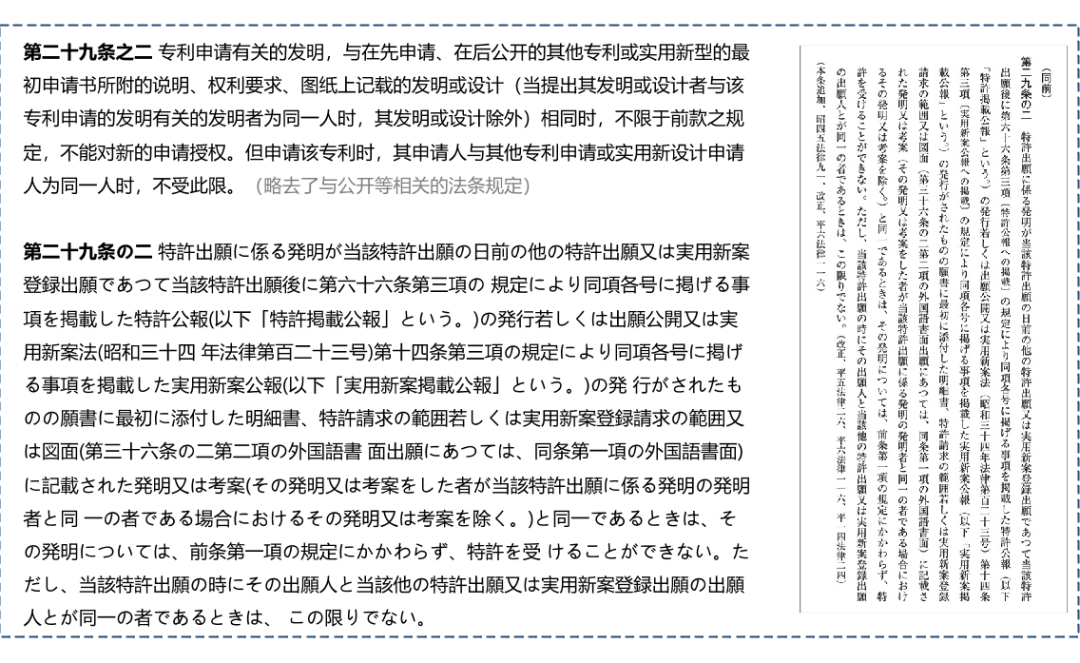 日本“抵觸申請(qǐng)”叫「拡大先願(yuàn)」(所謂“先愿”即“申請(qǐng)”),也被稱為「準(zhǔn)公知」,或「公知の擬制」,主要由《專利法》第二十九條第二款描述。