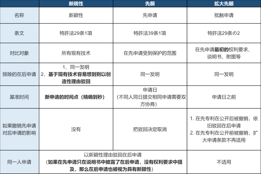 特別要注意,由于以上歷史原因,日本的“抵觸申請(qǐng)”條款不包含同一申請(qǐng)人或同一發(fā)明人的情形,所謂“相同”指代發(fā)明人完全相同或申請(qǐng)人完全相同。如果在先在后提交的兩份相同的申請(qǐng)的發(fā)明人全部相同或申請(qǐng)人全部相同,日本專利局不依據(jù)“擴(kuò)大先愿”駁回,轉(zhuǎn)而依據(jù)第三十九條「先願(yuàn)」的先申請(qǐng)制度,基于在后申請(qǐng)沒有「新規(guī)性」駁回。駁回的結(jié)果一樣,只是依據(jù)不同。中國(guó)則沒有這一例外。